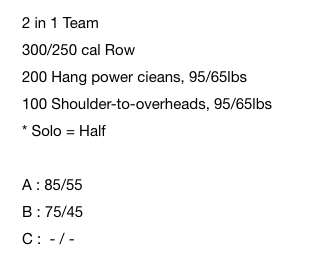 • A: Hang Power Cleans과 Shoulder-to-Overheads의 무게를 남성은 85파운드, 여성은 55파운드로 조정합니다.